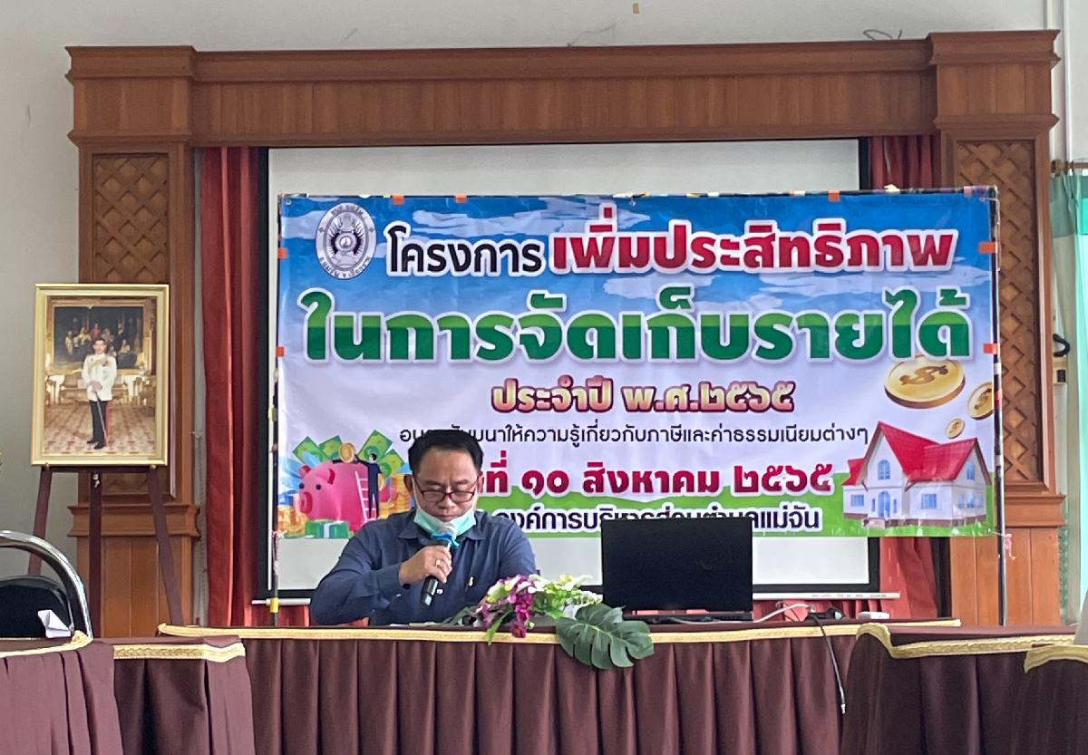 วันที่​ 10​ สิงหาคม​ 2565​ งานจัดเก็บรายได้​ กองคลัง​ ได้จัดทำโครงการ​เพิ่มประสิ​ท​ธิภาพ​ในการ​จัดเก็บ​รายได้​ ประ​จ​ำ​ปี​ 2565​ ณ องค์การบริหารส่วนตำบลแม่จัน เพื่อให้ความรู้เกี่ยวกับภาษีและค่าธรรมเนียมต่างๆ กับประชาชน โดยมีนายสายัณย์ ขัติยะ นายกองค์การบริหารส่วนตำบลแม่จัน เป็นประธานในพิธีเปิด